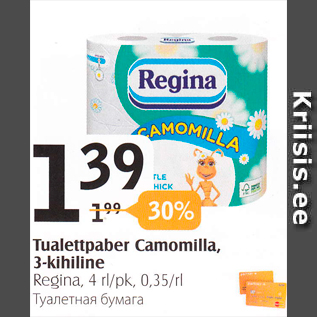 Kampaania periood: 23.04.2019 - 29.04.2019 Hind: 1.39€ Tualettpaber Camomilla, 3-kihilineRegina, 4 rl/pk