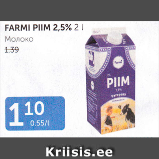 Kampaania periood: 23.04.2019 - 29.04.2019 Hind: 1.10€ FARMI PIIM 2,5%, 2 L
