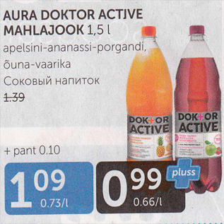 Kampaania periood: 28.05.2019 - 03.06.2019 Hind: 0.99€ AURA DOKTOR ACTIVE MAHLAJOOK 1,5 Lapelsini-ananassi-porgandi, õuna-vaarika