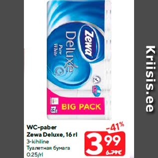 Toode wc-paber zewa deluxe, 16 rl oli müügil allahindlusega Maxima poes ajavahemikul 11.06.2019 kuni 17.06.2019 hinnaga 3.99 eurot.