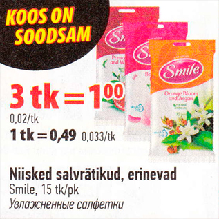 Kampaania periood: 02.07.2019 - 15.07.2019 Hind: 1.00€ Niisked salvrätikud, erinevadSmile, 15 tk/pk