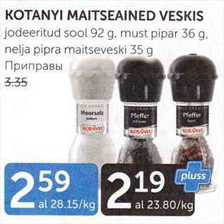 Kampaania periood: 06.08.2019 - 12.08.2019 Hind: 2.19€ KOTANYI MAITSEAINET VESKISjodeeritud sool 92 g, must pipar 36 g, nelja pipra maitseveski 35 g