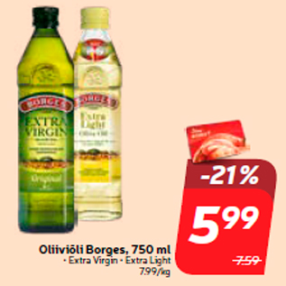 Kampaania periood: 13.08.2019 - 19.08.2019 Hind: 5.99€ Oliiviõli Borges, 750 ml• Extra Virgin • Extra Light