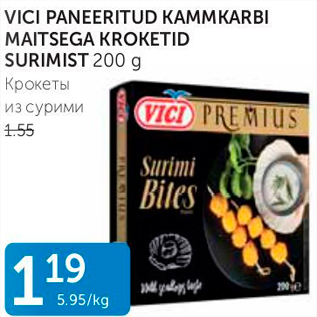 Kampaania periood: 27.08.2019 - 02.09.2019 Hind: 1.19€ VICI PANEERITUD KAMMKARBI MAITSEGA KROKETID SURIMIST 200 G