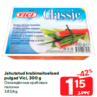 Kampaania periood: 17.09.2019 - 23.09.2019 Hind: 1.15€ Jahutatud krabimaitselised pulgad Vici, 300 g