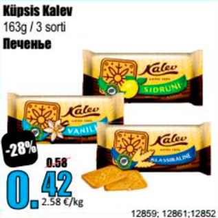 Kampaania periood: 23.09.2019 - 29.09.2019 Hind: 0.42€ Küpsis Kalev163 g / 3 sorti