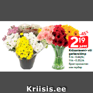 Kampaania periood: 15.10.2019 - 21.10.2019 Hind: 2.19€ Krüsanteemi- või gerberakimp5 tk - 0.44/tk; 11 tk - 0.20/tk
