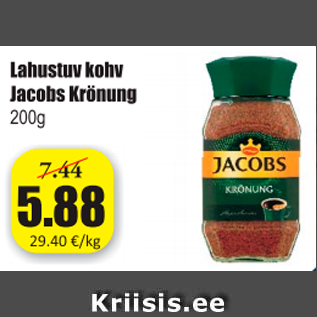 Kampaania periood: 15.11.2019 - 28.11.2019 Hind: 5.88€ Lahustuv kohv Jacobs Krönung 200 g
