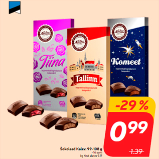 Kampaania periood: 26.11.2019 - 02.12.2019 Hind: 0.99€ Šokolaad Kalev, 99-108 g• 10 sorti