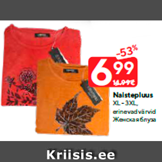 Kampaania periood: 26.11.2019 - 02.12.2019 Hind: 6.99€ NaistepluusXL - 3XL, erinevad värvid