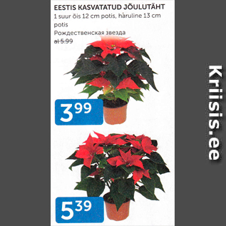 Kampaania periood: 03.12.2019 - 16.12.2019 Hind: 3.99€ EESTI KASVATATUD JÕULUTÄHT1 suurus õis 12 cm potis, haruline 13 cm potis