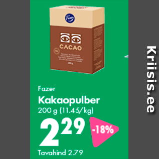 Kampaania periood: 18.02.2020 - 23.02.2020 Hind: 2.29€ Fazer Kakaopulber 200 g