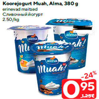 Kaup koorejogurt muah, alma, 380 g oli müügil allahindlusega Maxima poes ajavahemikul 25.02.2020 kuni 02.03.2020 hinnaga 0.95 eurot.