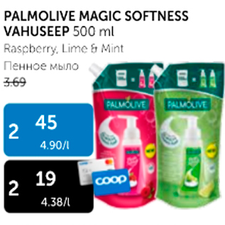 Kampaania periood: 03.03.2020 - 09.03.2020 Hind: 2.19€ PALMOLIVE MAGIC SOFTNESS VAHUSEEP 500 mlRaspberry, Lime&Mint