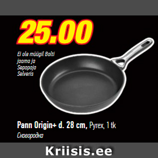 Kampaania periood: 06.03.2020 - 23.03.2020 Hind: 25.00€ Pann Origin+ d. 28 cm, Pyrex, 1 tkEi ole müügil Balti jaama ja Sepapaja Selveris