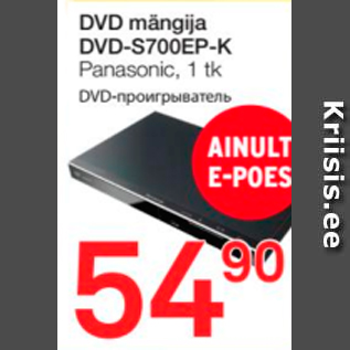 Kampaania periood: 07.04.2020 - 20.04.2020 Hind: 54.90€ DVD mängija DVD-S700EP-KPanasonic, 1 tk