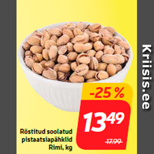 Kampaania periood: 12.05.2020 - 18.05.2020 Hind: 13.49€ Röstitud soolatud pistaatsiapähklid Rimi, kg