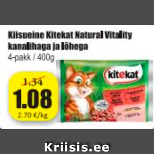 Kampaania periood: 10.07.2020 - 16.07.2020 Hind: 1.08€ Kiisueine Kitekat Natural Vitality kanalihaga ja lõhega4-pakk / 400 g