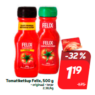 Kampaania periood: 28.07.2020 - 03.08.2020 Hind: 1.19€ Tomatiketšup Felix, 500 g• originaal • terav