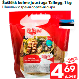 Kampaania periood: 11.08.2020 - 17.08.2020 Hind: 4.69€ Šašlõkk kolme juustuga Tallegg, 1 kg