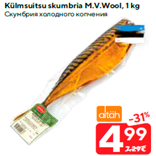 Kampaania periood: 11.08.2020 - 17.08.2020 Hind: 4.99€ Külmsuitsu skumbria M.V.Wool, 1 kg
