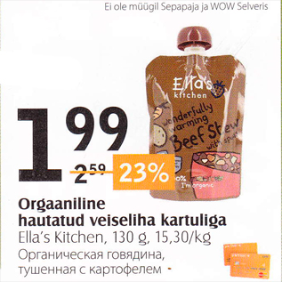 Kampaania periood: 18.08.2020 - 24.08.2020 Hind: 1.99€ Orgaaniline hautatud veiseliha kartuligaElla´s Kitchen, 130 g