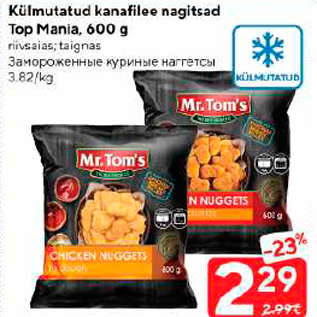 Kampaania periood: 15.09.2020 - 21.09.2020 Hind: 2.29€ Külmutatud kanafilee nagitsad Top Mania, 600 griivsaias; taignas