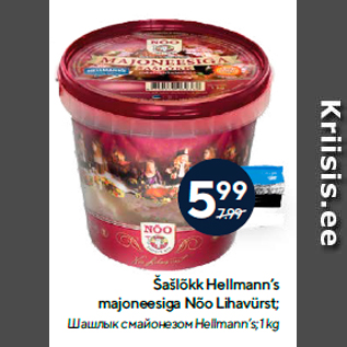 Kampaania periood: 01.10.2020 - 21.10.2020 Hind: 5.99€ Šašlõkk Hellmann’s majoneesiga Nõo Lihavürst; 1 kg