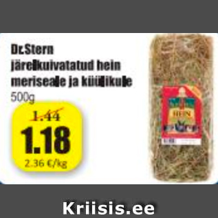 Kaup dr. stern järelkuivatatud hein meriseale ja küülikule 500 g oli müügil allahindlusega Grossi poes ajavahemikul 09.10.2020 kuni 15.10.2020 hinnaga 1.18 eurot.