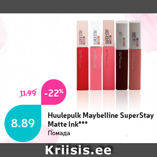 Kampaania periood: 20.10.2020 - 16.11.2020 Hind: 8.89€ Huulepulk Maybelline SuperStay Matte Ink****** v.a Pae ja Mustamäe Keskuse Rimi hyperites