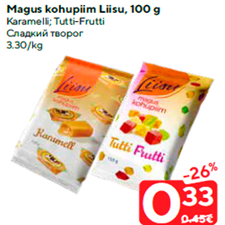Kampaania periood: 27.10.2020 - 02.11.2020 Hind: 0.33€ Magus kohupiim Liisu, 100 gKaramelli; Tutti-Frutti