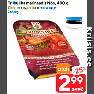 Kaup triibuliha marinaadis nõo, 400 g oli müügil allahindlusega Maxima poes ajavahemikul 29.12.2020 kuni 04.01.2021 hinnaga 2.99 eurot.