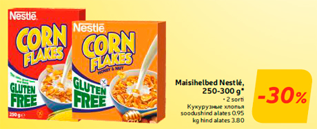 Tähelepanu! Kampaania on lõppenud! Toode maisihelbed nestlé, 250-300 g* -30% oli müügil allahindlusega Hüper Rimi poes ajavahemikul 27.02.2017 kuni 05.03.2018 Hüper Rimi