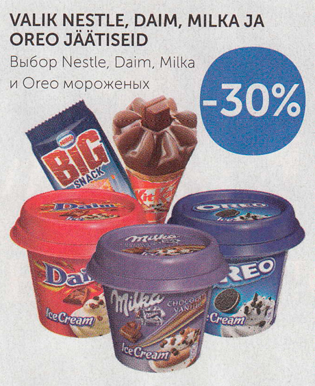 Tähelepanu! Kampaania on lõppenud! Toode valik nestle, daim, milka ja oreo jäätised -30% oli müügil allahindlusega Maksimarketi ja Konsumi poodides ajavahemikul 03.07.2018 kuni 09.07.2018 Maksimarket, Konsum