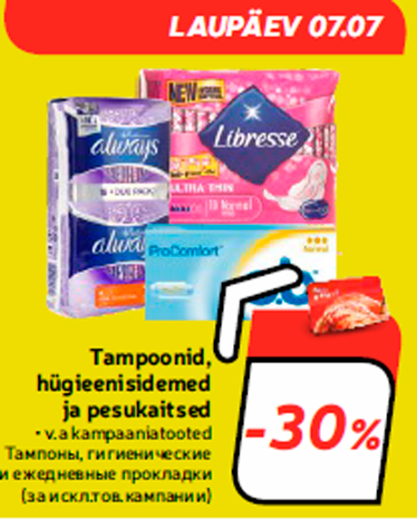 Tähelepanu! Kampaania on lõppenud! Toode tampoonid, hügieenisidemed ja pesukaitsed -30% oli müügil allahindlusega Hüper Rimi, Rimi, Mini Rimi poodides ajavahemikul 07.07.2018 kuni 07.07.2018 Hüper Rimi, Rimi, Mini Rimi
