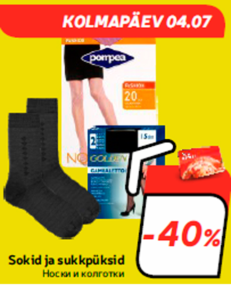 Tähelepanu! Kampaania on lõppenud! Toode sokid ja sukkpüksid -40% oli müügil allahindlusega Hüper Rimi, Rimi, Mini Rimi poodides ajavahemikul 04.07.2018 kuni 04.07.2018 Hüper Rimi, Rimi, Mini Rimi