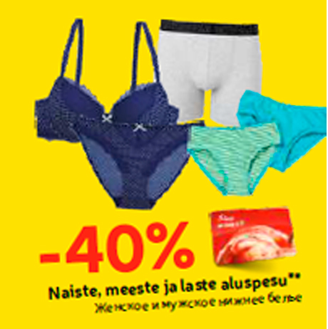 Tähelepanu! Kampaania on lõppenud! Toode naiste, meeste ja laste aluspesu** -40% oli müügil allahindlusega Hüper Rimi poes ajavahemikul 09.08.2018 kuni 09.08.2018 Hüper Rimi