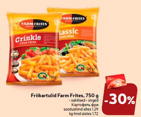 Tähelepanu! Kampaania on lõppenud! Toode friikartulid farm frites, 750 g -30% oli müügil allahindlusega Hüper Rimi poes ajavahemikul 28.08.2018 kuni 10.09.2018 Hüper Rimi