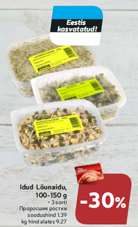 Tähelepanu! Kampaania on lõppenud! Toode idud lõunaidu, 100-150 g -30% oli müügil allahindlusega Hüper Rimi, Rimi, Mini Rimi poodides ajavahemikul 09.11.2018 kuni 11.11.2018 Hüper Rimi, Rimi, Mini Rimi