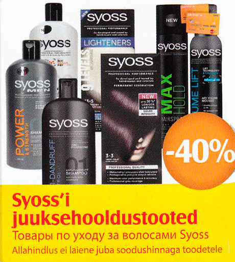 Tähelepanu! Kampaania on lõppenud! Toode syoss´i juuksehooldustooted -40% oli müügil allahindlusega Selveri poes ajavahemikul 19.02.2019 kuni 25.02.2019 Selver