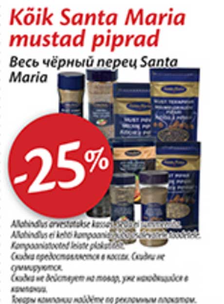 Tähelepanu! Kampaania on lõppenud! Toode kõik santa maria mustad piprad -25% oli müügil allahindlusega Maxima poes ajavahemikul 27.08.2013 kuni 02.09.2013 Maxima X