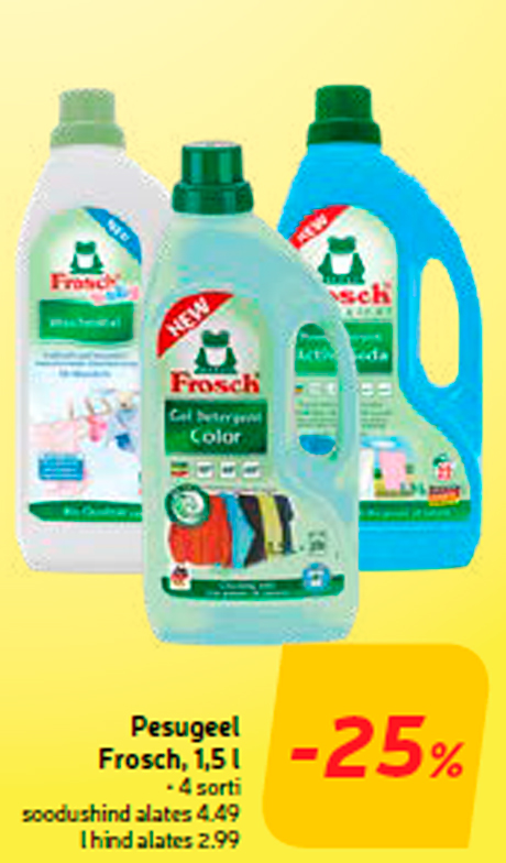 Toode pesugeel frosch, 1,5 l -25% oli müügil allahindlusega Hüper Rimi poes ajavahemikul 12.05.2020 kuni 18.05.2020