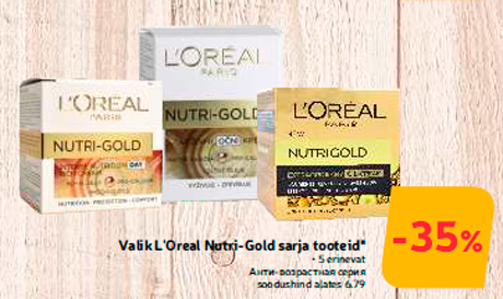 Tähelepanu! Kampaania on lõppenud! Toode valik l'oreal nutri-gold sarja tooteid* -35% oli müügil allahindlusega Hüper Rimi poes ajavahemikul 18.07.2017 kuni 24.07.2017 Hüper Rimi
