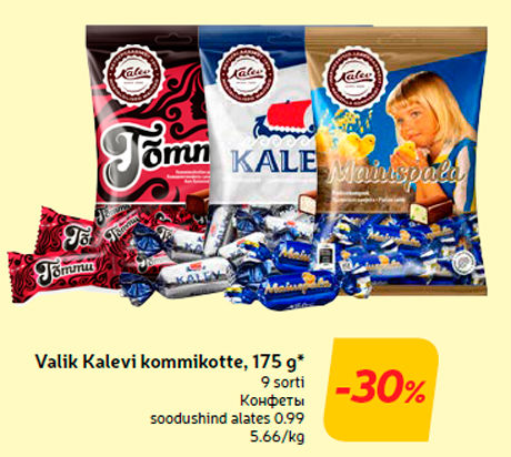 Tähelepanu! Kampaania on lõppenud! Toode valik kalevi kommikotte, 175 g* -30% oli müügil allahindlusega Hüper Rimi ja Rimi poodides ajavahemikul 07.11.2017 kuni 13.11.2017 Hüper Rimi, Rimi