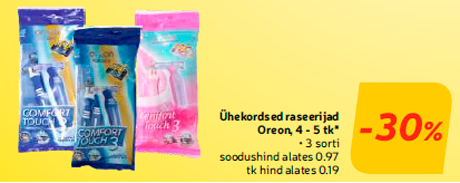Внимание! Данная кампания закончилась! Товар одноразовые бритвы oreon, 4 - 5 шт. * -30% продавался со скидкой в магазине Hüper Rimi, Rimi, Mini Rimi в период с 07.05.2019 по 13.05.2019 Hüper Rimi, Rimi, Mini Rimi
