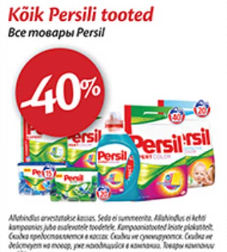 Все товары Persil -40%Период кампании: 05.11.2013 - 11.11.2013 Kriisis.ee не несёт ответственности за содержание комментариев. Мнение автора комментария может отличаться от мнения kriisis.ee. По возможности, отслеживая комментарии, kriisis.ee оставляет за собой право удалять их без объяснения причин. Если вы заметили неуместный комментарий, пожалуйста сообщите нам о нём. |