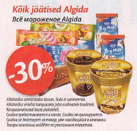 Всё мороженое AlgidaВсё мороженое Algida -30% Период кампании: 05.06.2012 - 11.06.2012 Kriisis.ee не несёт ответственности за содержание комментариев. Мнение автора комментария может отличаться от мнения kriisis.ee. По возможности, отслеживая комментарии, kriisis.ee оставляет за собой право удалять их без объяснения причин. Если вы заметили неуместный комментарий, пожалуйста сообщите нам о нём. |