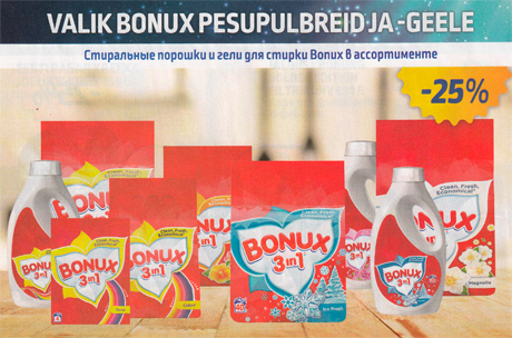 Внимание! Данная кампания закончилась! Товар стиральные порошки и гели для стирки bonux в ассортименте -25% продавался со скидкой в магазине Maksimarket, Konsum в период с 25.07.2017 по 31.07.2017 Maksimarket, Konsum