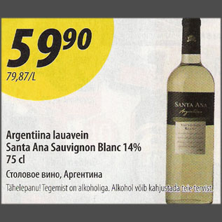 Период кампании: 06.05.2010 - 19.05.2010 Столовое вино, Аргентина14%, 75cl Argentiina lauavein Santa Ana Sauvignon Blanc Kriisis.ee не несёт ответственности за содержание комментариев. Мнение автора комментария может отличаться от мнения kriisis.ee. По возможности, отслеживая комментарии, kriisis.ee оставляет за собой право удалять их без объяснения причин. Если вы заметили неуместный комментарий, пожалуйста сообщите нам о нём.