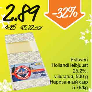 Период кампании: 30.01.2012 - 05.02.2012 Цена: 2.89€ Нарезанный сырEstoveri Hollandi leibjuust